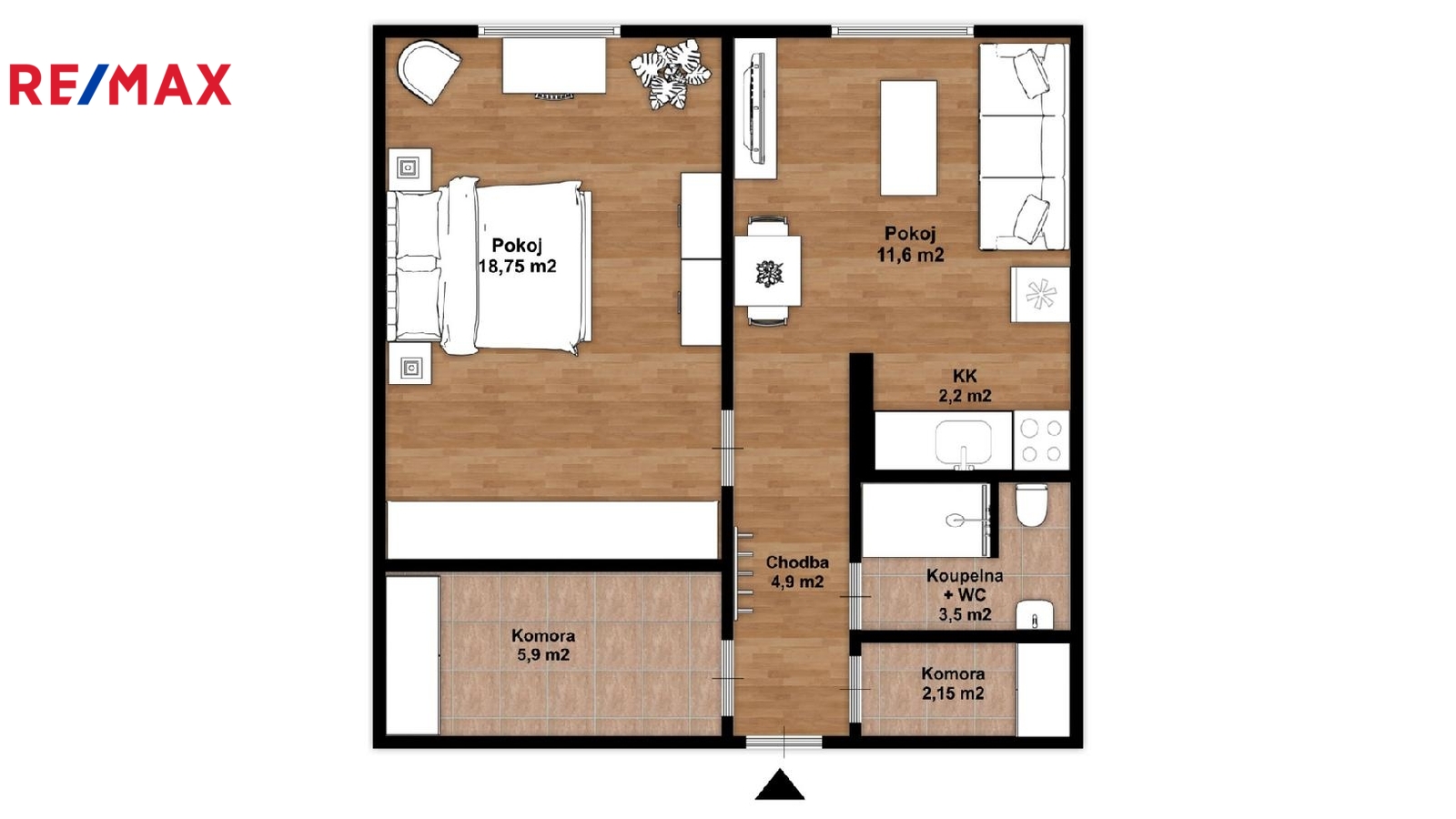 Prodej bytu 2+kk, 49 m2 užitné plochy + 2 m2 komora + 1,4 m2 sklep